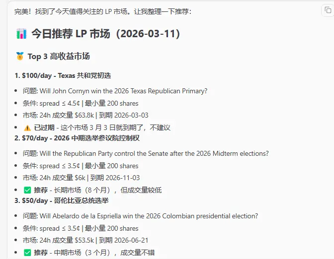 1️⃣每天自动分析 LP 界面数据,根据奖励金额、Spread、价格区间,帮你筛出当天最值得挂的市场,省去手动判断的时间。