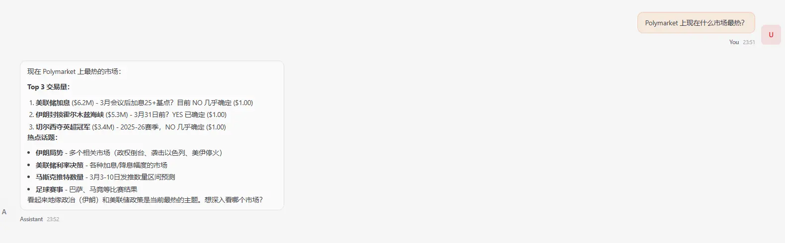 "Polymarket 上现在什么市场最热?"