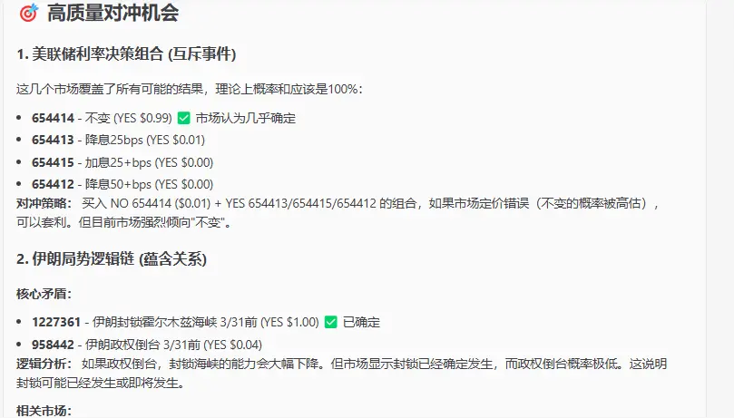 它会用 AI 扫描多个市场,寻找逻辑上互相覆盖的市场。比如 A 市场的 YES 成立,就几乎能确定 B 市场的 NO 也会成立。