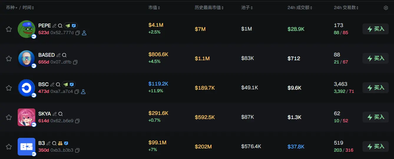 过去 24h Base 热门代币前五依次为:PEPE、BASED、BSC、SKYA、B3