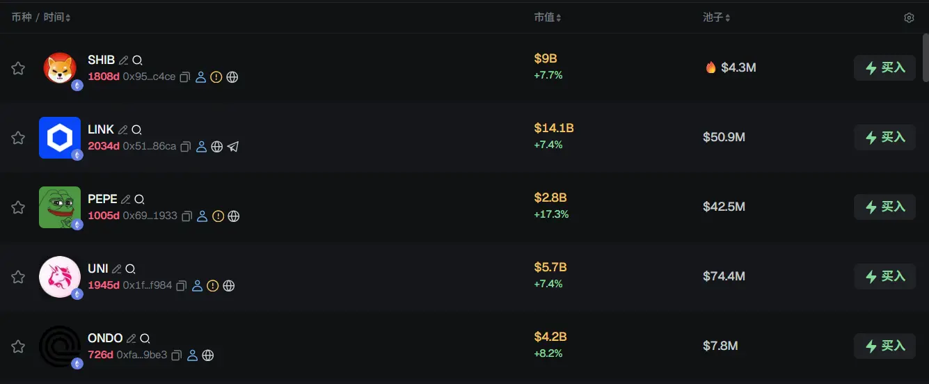 过去 24h ETH 热门代币前五依次为:SHIB、LINK、PEPE、UNI、ONDO