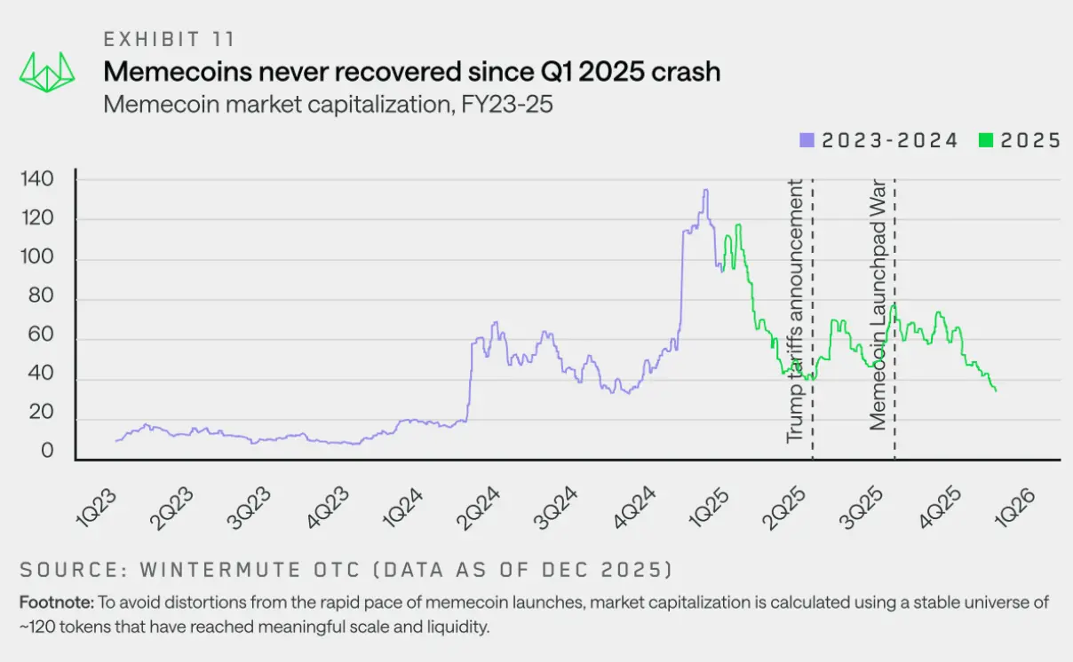 “Meme 币在 2025 年第一季度见顶后未能恢复,因交易趋于分散化与收窄而无法重获支撑。”