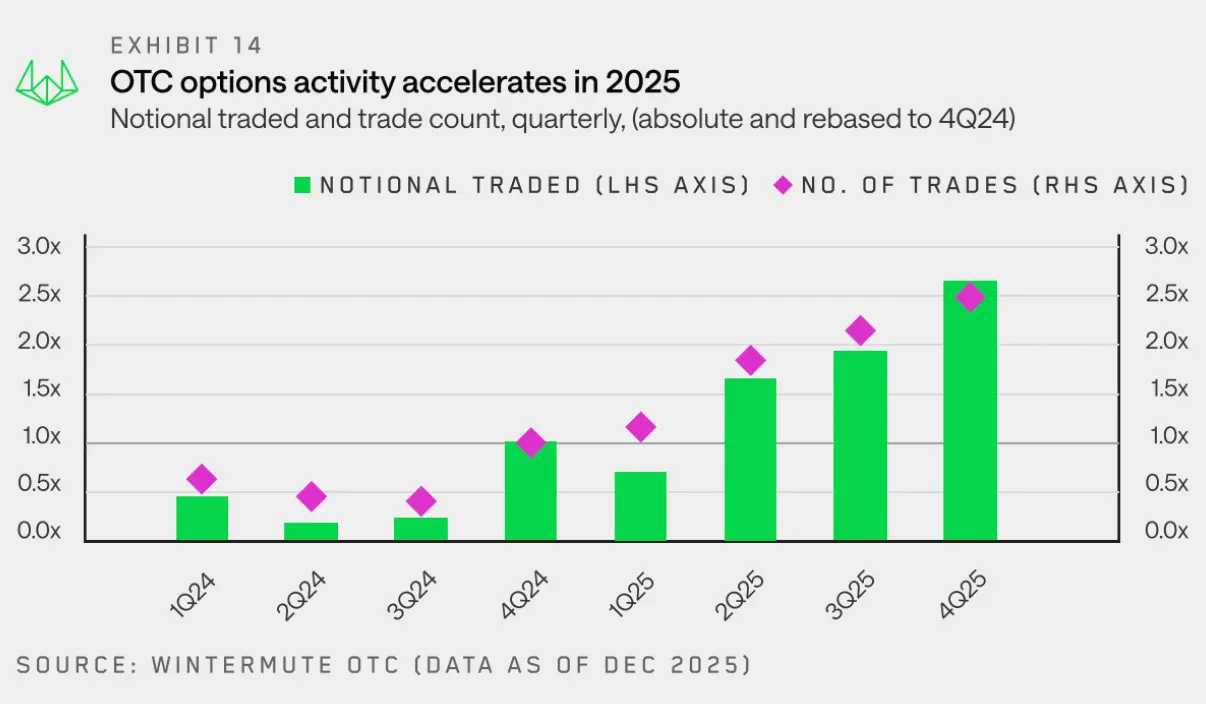 这一转变推动期权市场活动急剧增长:从 2024 年第四季度到 2025 年第四季度,名义交易额和交易笔数均实现约 2.5 倍的同比增长。这主要得益于更多交易对手方 —— 尤其是加密基金和数字资产财库——采用期权策略以获取被动收益。