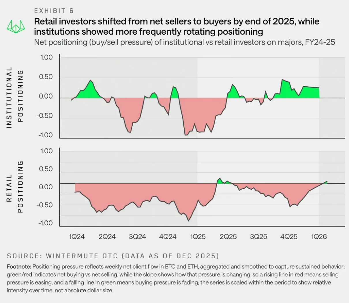 资金转向主流币的趋势系由市场疲态推动,原因在于“山寨季”始终未能真正启动,市场逐步进入失望情况。这一趋势最初由机构引领(它们长期是主流币的净买家),但到年底时,散户也转为了净买家。
