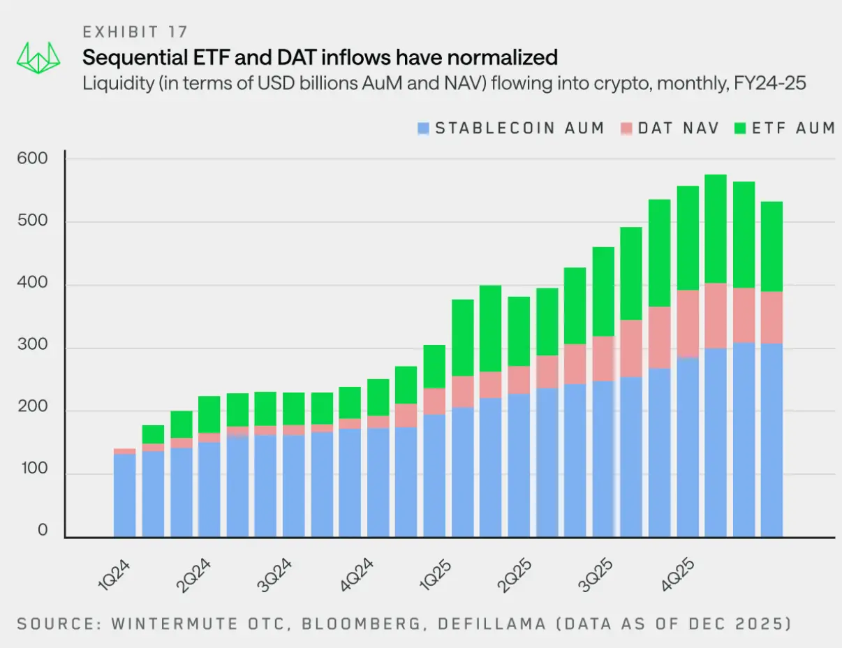 直到两年前,稳定币和直接投资仍是资本进入加密市场的主要渠道。然而,ETF 和 DAT 从结构上改变了流动性注入生态系统的路径。