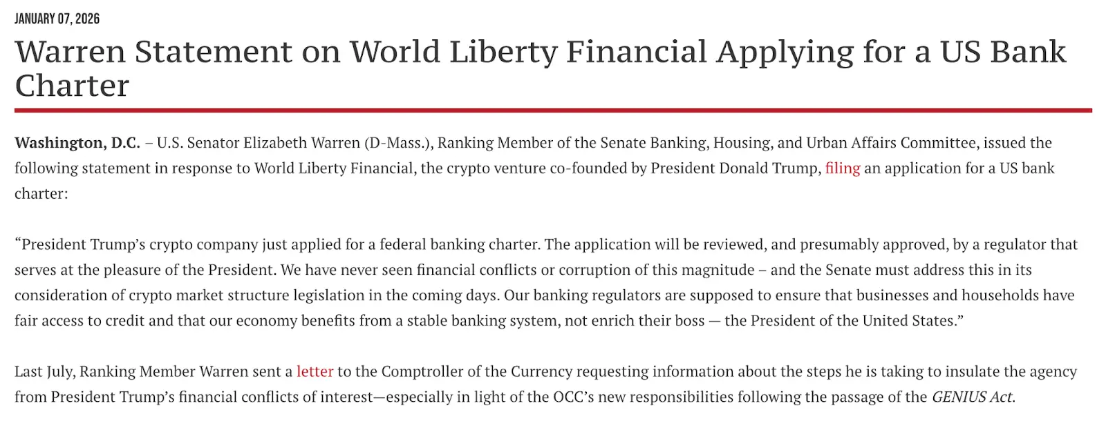 WLF 旗下实体于上周正式向美国货币总稽查办公室 (OCC) 申请“国家信托银行牌照”。此举随即引发政治风暴,争议核心是:一个由总统亲自任命的监管首长,是否有权审核总统家族控股的商业银行申请?民主党领袖 Elizabeth Warren 随即发表声明,直指其中的利益冲突: