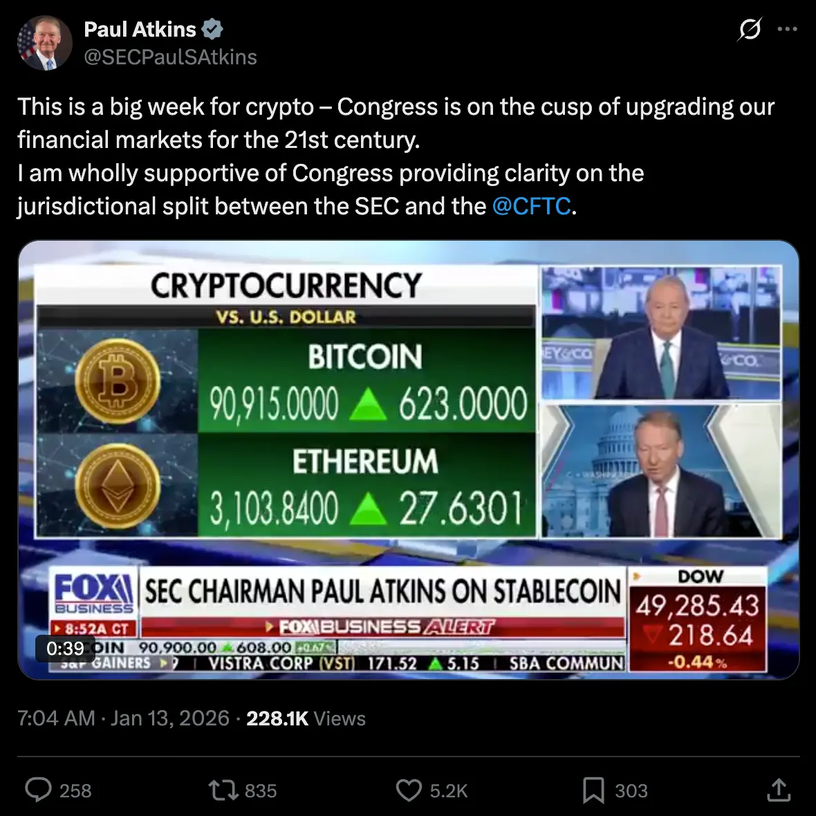 SEC 主席 Paul Atkins 于 1 月 13 日在 X 上发文强调,本周对加密货币产业具备里程碑意义,并公开支持国会明确划分 SEC 与 CFTC 的管辖边界,明显有别于前任主席深受诟病的“执法式监管”,Atkins 支持推动立法框架,力求将加密市场引出监管灰色地带。