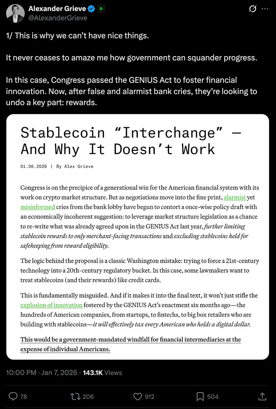 另一方面,Paradigm 政府事务副总裁 Alexander Grieve 则将银行业的诉求定性为“虚假且危言耸听”的政治干预。他认为,若立法者被迫修改《GENIUS 法案》中的奖励条款,强制分销商禁付收益,实质上等同于对稳定币持有者征收“隐性持有税”,强行让中间商截留本应属于消费者的利润。Grieve 警告,这种为了保护传统金融利润而牺牲技术创新的行为,将严重削弱美国稳定币生态的国际吸引力,导致美国在 Web3 金融基础设施的竞争中全面落后。