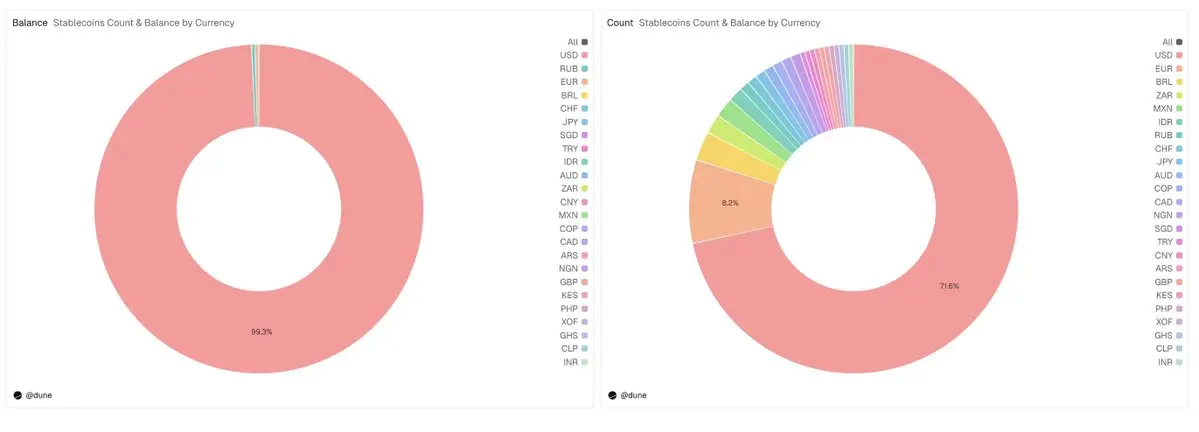 本次分析主要聚焦于 15 种美元稳定币,但完整的数据集远远不止于此。它追踪了超过 200 种稳定币,代表了 20 多种法币:欧元(17 种代币,供应量 9.9 亿美元)、巴西雷亚尔(1.41 亿美元)、日元(1300 万美元),以及以 NGN(尼日利亚奈拉)、KES(肯尼亚先令)、ZAR(南非兰特)、TRY(土耳其里拉)、IDR(印尼盾)、SGD(新加坡元)等计价的代币。