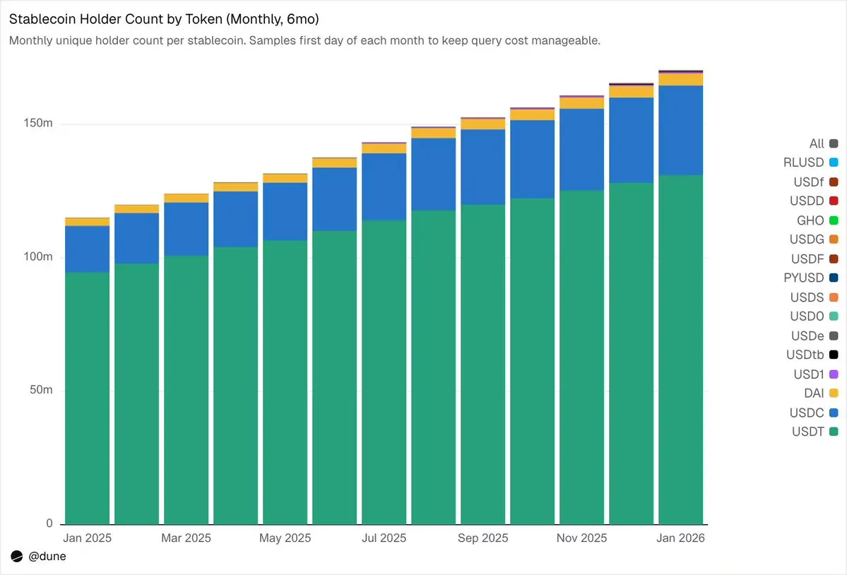 截至 2026 年 2 月,共有 1.72 亿个独立地址持有这 15 种稳定币中的至少一种。其中,USDT 占了 1.36 亿个地址,USDC 为 3600 万,DAI 为 470 万。这三种稳定币拥有真正广泛的分布:它们排名前 10 的钱包仅持有 23–26% 的供应量,且 HHI(赫芬达尔-赫希曼指数,标准的经济集中度指标,0 表示完全分散,1.0 表示单一持有者)低于 0.03。