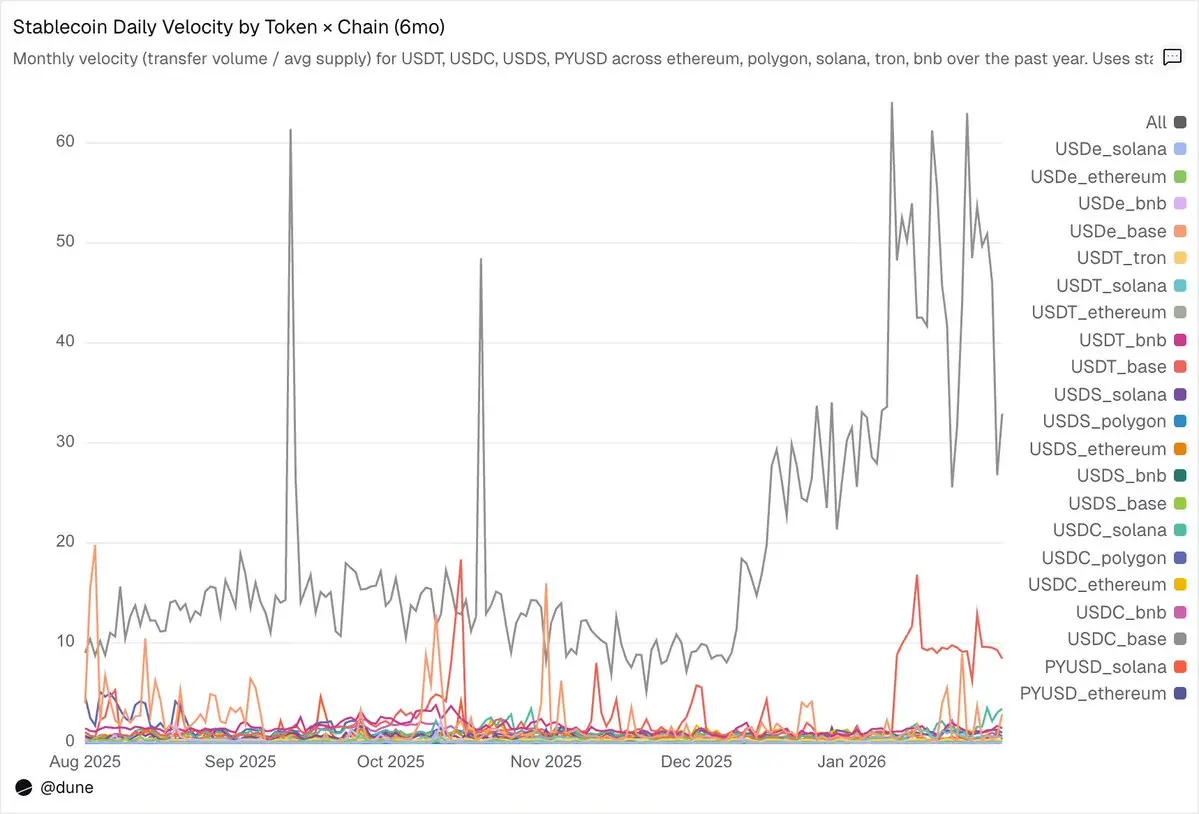 供应量和转账量各自只讲述了故事的一部分。流通速度将它们联系在一起,这一个单一的指标就能捕捉到:特定链上的某种稳定币,究竟是在作为活跃的基础设施运行,还是仅仅作为闲置资金停放。