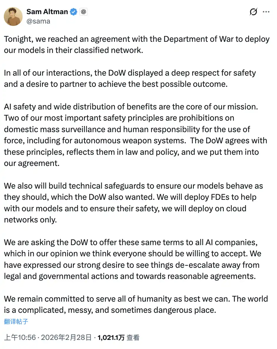 北京时间 2 月 28 日上午,Sam Altman 发了一条推文:「今晚,我们与美国陆军部达成协议,将我们的模型部署到他们的机密网络中。」