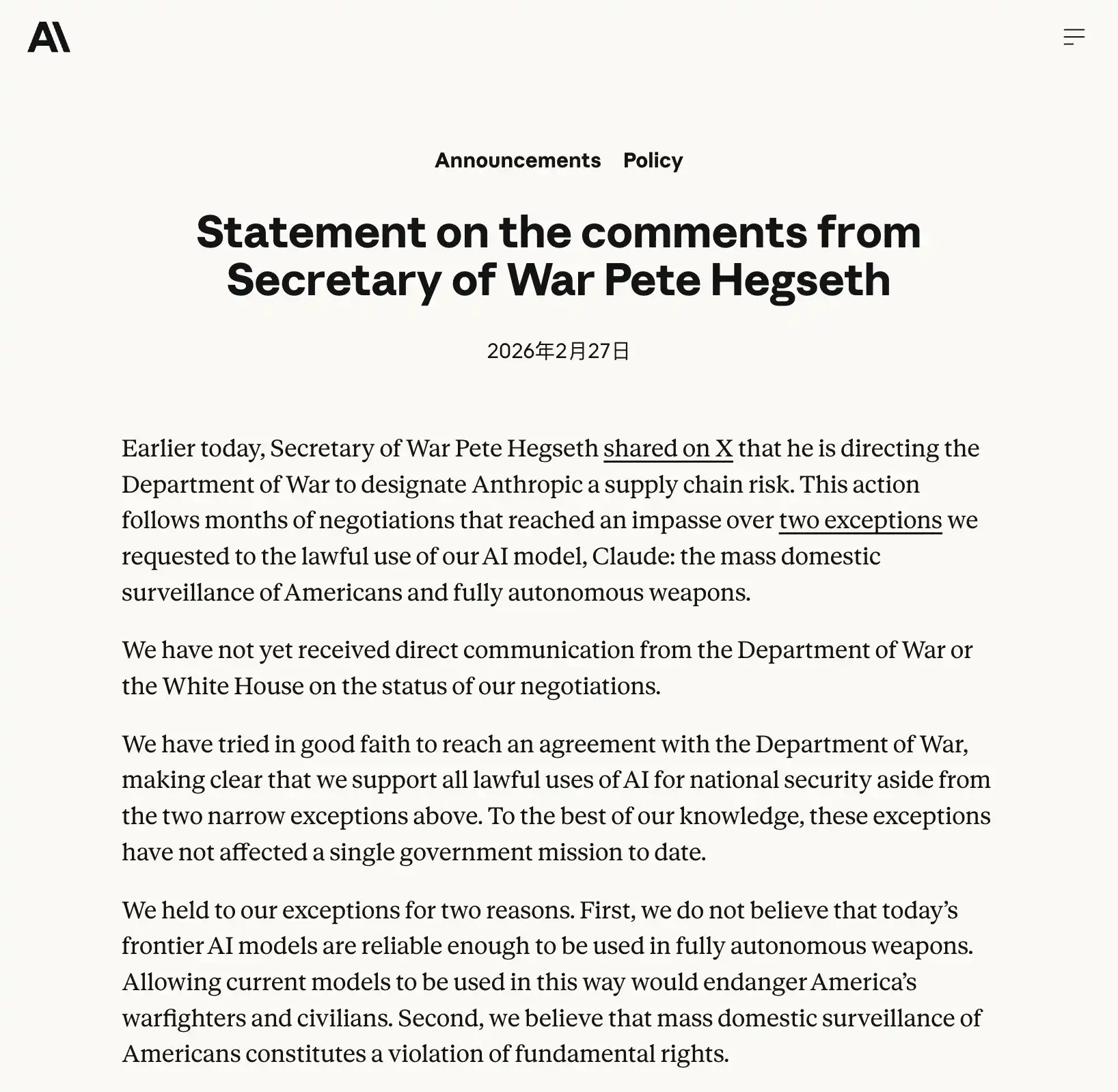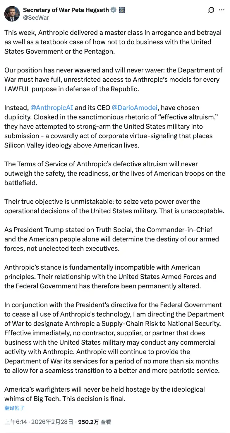 Anthropic 的最后通牒时间到了。Dario 没有妥协。Trump 在 Truth Social 上宣布封禁,Hegseth 在 X 上发文将 Anthropic 列为「供应链风险」,Anthropic 宣布将通过法律途径应对。