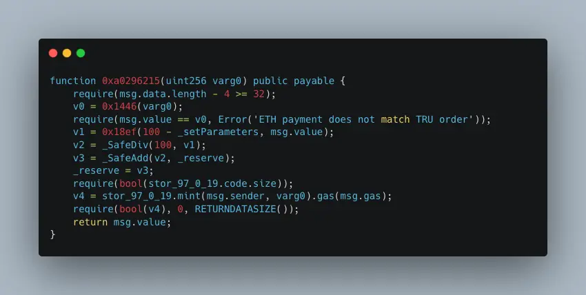 2.攻击者调用0xa0296215(c6e3ae8e2cbab1298abaa3)函数,同时 msg.value 为0。最后成功铸造240442509453545333947284131枚TRU。