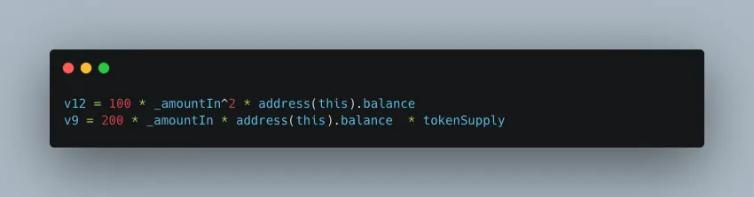 观察0x1446函数中的逻辑,因为最后的计算结果v13 == 0,所以一定是上文中的计算逻辑出现了问题。需要了解的是0x18ef功能与_SafeMul相同,因此问题出在使用原生加分 v12 v9(合约版本为 ^0.6.10 ,因此无溢出检查)。