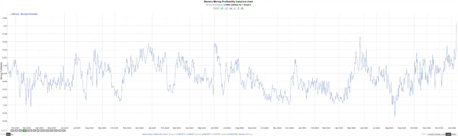 在 2025 年 4 月之前,Monero 网络的挖矿收益经历了一次明显下跌。配合当时的难度图来看,当时算力急剧上升,但币价维持震荡。这种背离导致收益被摊薄,可能迫使一些成本较高的小型矿工退出市场,数据显示,4 月份挖矿难度一度回调也印证了这个猜想。