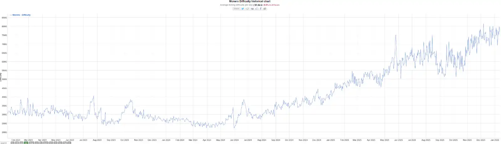 挖矿历史难度通常代表资本参与网络生态的热情。数据显示,XMR 的挖矿难度在 2024 年底开始迅速攀升,整个 2025 年上半年都处于快速增长状态。虽然在 9 月到 11 月期间有所波动,但近期又开始了新的一轮难度爬升。