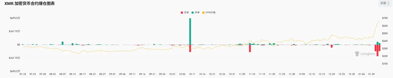 在现货方面,XMR 近期的成交量随着行情上涨虽有所提升,但也基本维持在数千万美元到 2 亿美元的区间,并没有出现特别夸张的增量。回顾历史,真正且显著的现货交易量高点还是在 11 月 10 日创造的 4.1 亿美元。这意味着,近期这一轮翻倍行情中,现货交易(或者说中心化交易平台内的现货买盘)并不是最大推手。
