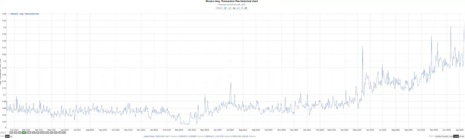 从图表来看,Monero 的平均交易费用在 2025 年上半年之前相对平稳,基本维持在 0.1 美元以下。但进入 6 月,增长趋势开始显现;到 12 月 11 日,最高的平均费用一度达到 0.3 美元以上,较半年前增长 3 倍以上。