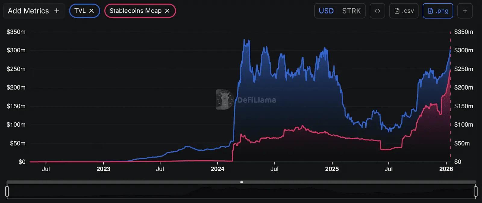 根据 DeFiLlama 数据,Starknet 的 TVL 现已攀升至 3.02 亿美元,这是自 2024 年以来首次重返 3 亿美元,走出当时的低谷。而该网络的稳定币市值也升至约 2.48 亿美元,创下历史新高,稳定币市值的增长通常被视为 DeFi 参与度加深的关键指标。
