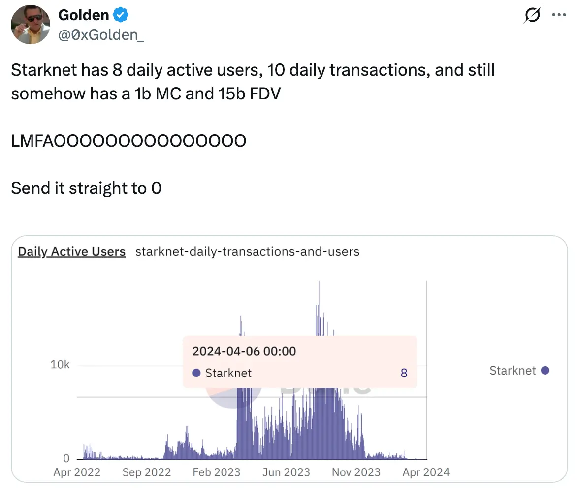 昨晚 Solana 官方 X 账号发文直指,“Starknet 目前日活跃用户仅有 8 人,日交易量仅 10 笔,但其市值仍达 10 亿美元,完全稀释市值(FDV)高达 150 亿美元。”