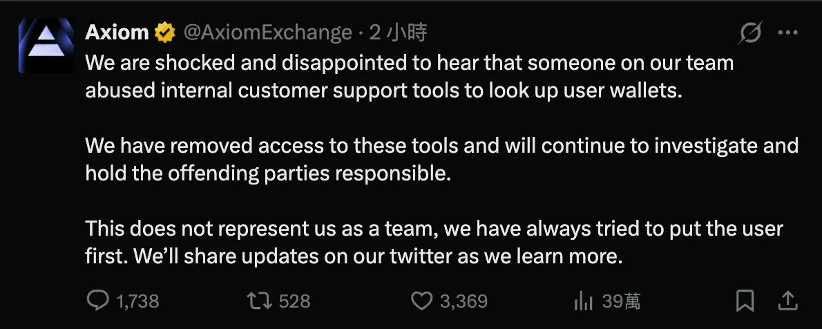 在 ZachXBT 报告发布后,Axiom 官方走了一套标准的公关危机处理方式:发表声明表示“震惊与失望”,撤销权限并启动调查。然而,这仍然无法掩盖背后的结构性失能,这类事件揭示了平台在权限管控上的失守,而非仅仅是单一员工的个人行为。