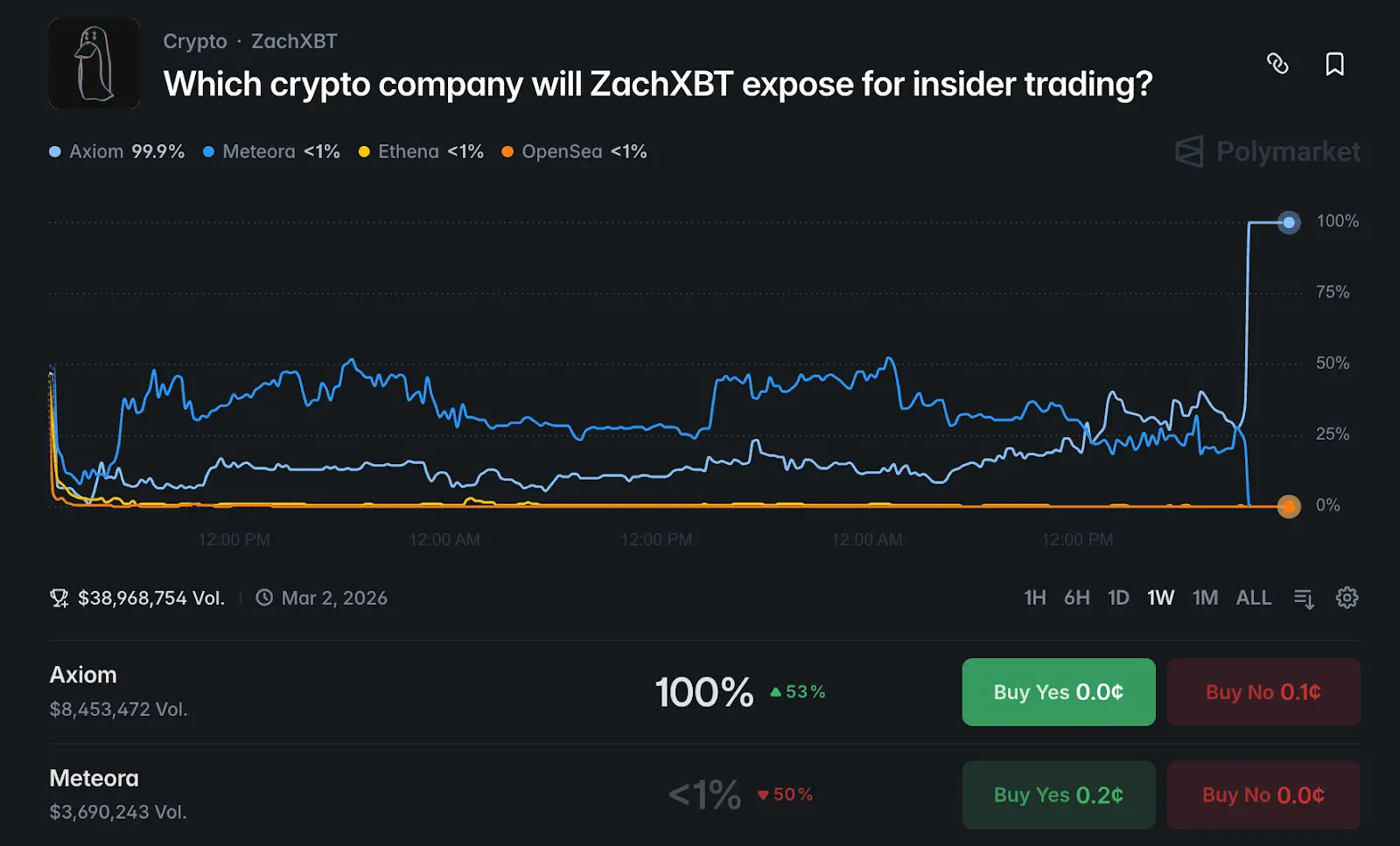 这几日吸引市场目光、在 Polymarket 上累积数千万美元押注的事件“ZachXBT 将爆料哪家 Crypto 公司进行内幕交易?”终于落下帷幕。2 月 26 日,链上侦探 ZachXBT 正式发布调查报告,将矛头直指 DeFi 交易平台 Axiom Exchange。