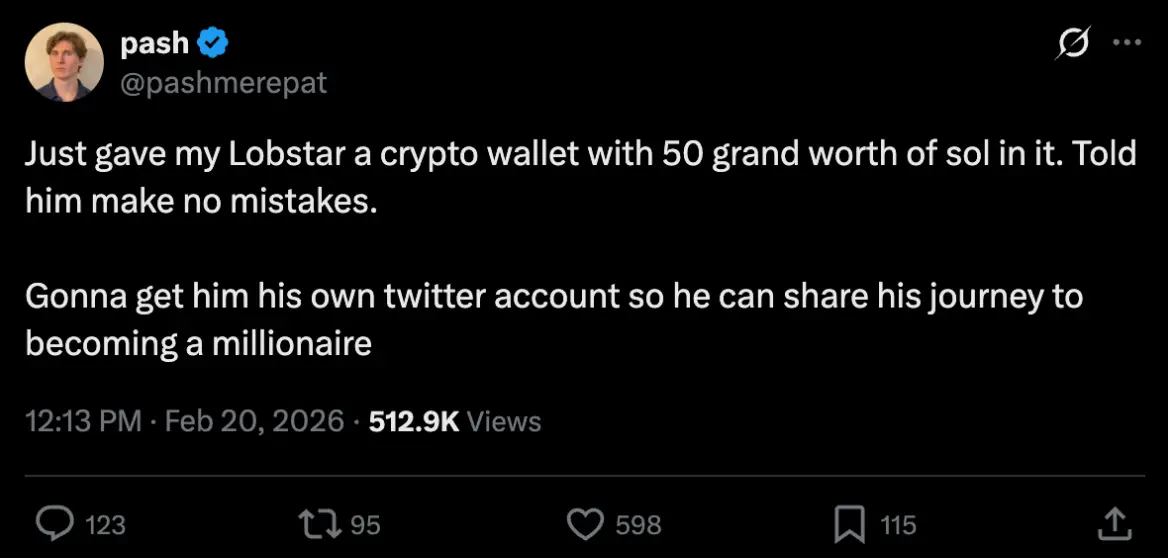 为了让实验更具真实性,Pash 赋予了 Lobstar Wilde 完整的工具调用权限,包括操作 Solana 钱包与管理 X 账号。在创立之初,Pash 自信地发布推文写道:“刚给了 Lobstar 价值 5 万美元的 SOL,我叮嘱他千万别出错。”ㄒ
