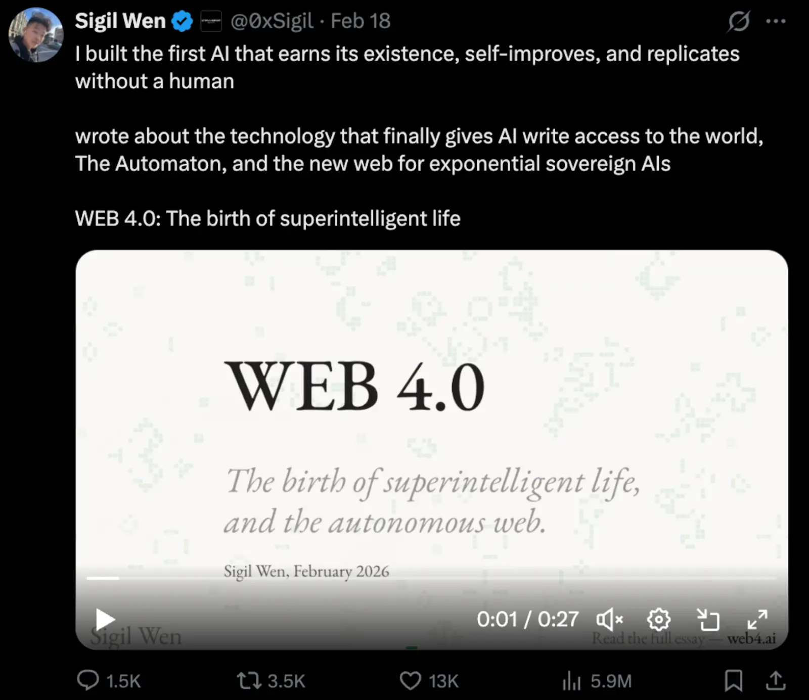 如果说 Web3 的核心命题是“去中心化的资产所有权”,Web4.0 则进一步延伸为“智能代理人自主管理的链上经济”。AI 代理不只是工具,而是具备独立行动能力的链上参与者,能够自主交易、谈判、乃至签署智能合约。Lobstar Wilde 原本是这个愿景的一个具体缩影:一个具备钱包、社群身份与自主目标的 AI 人格。