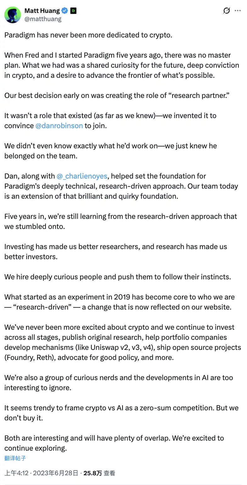 联合创始人 Matt Huang 不得不出来灭火。他发推说,Paradigm「从未像现在这样对 crypto 感到兴奋」,同时补充道:「AI 领域的发展太引人注目,不容忽视。把 AI 和 crypto 框架成零和竞争是一种流行但错误的叙事。我们不认同。两者都很有趣,将有大量重叠。」