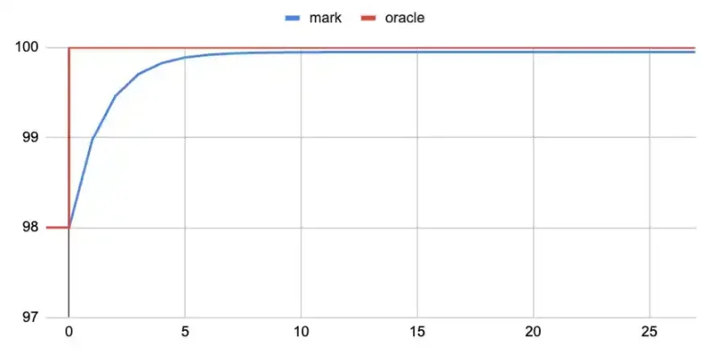 由于标记价格比预言机价格低,资金费率就变成了负数。负的资金费率意味着空头要付钱给多头。再往前推到 T-2、T-3 时刻,标记价格会逐步从 99.95、99.90... 一路滑到 98.975。每个小时,空头都要支付一笔资金费给多头。