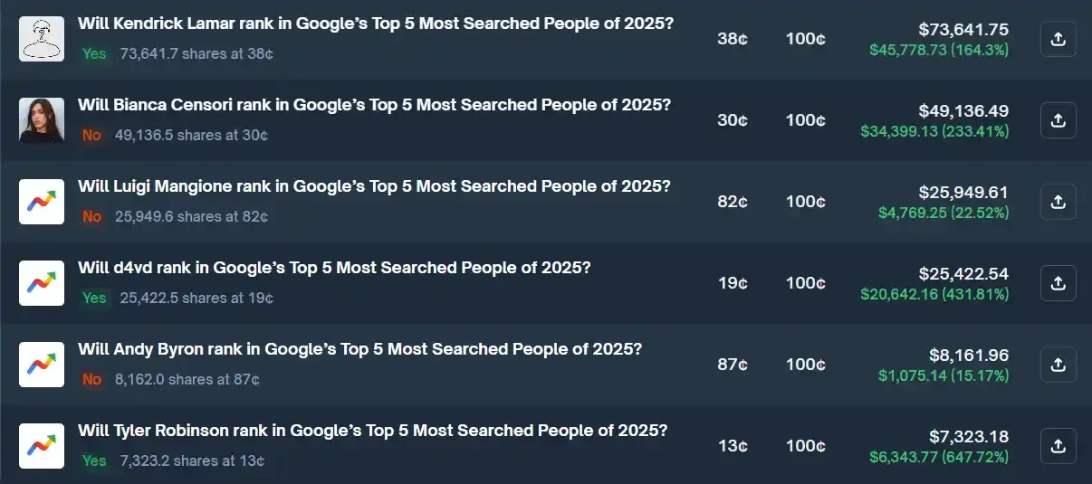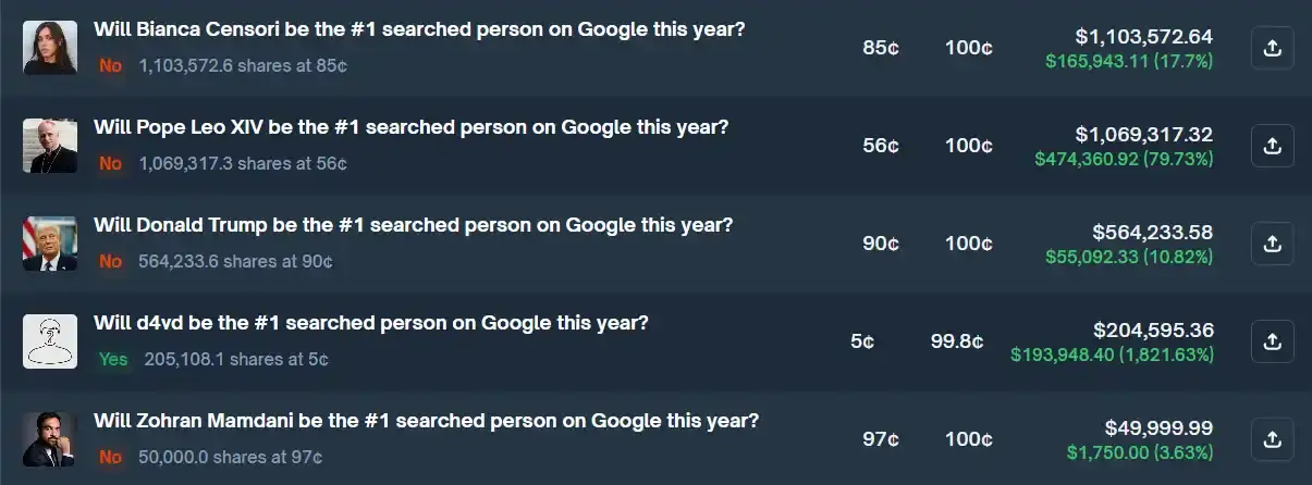 然而,就在他扫完单不到几个小时,谷歌突然发布了年度热搜榜单。当排名公布的一瞬间,整个市场都集体愣住了——榜首既不是教皇,也不是特朗普,更不是任何一个热门选项,而是那个长期概率接近零、交易员连资料都懒得查的名字:d4vd。