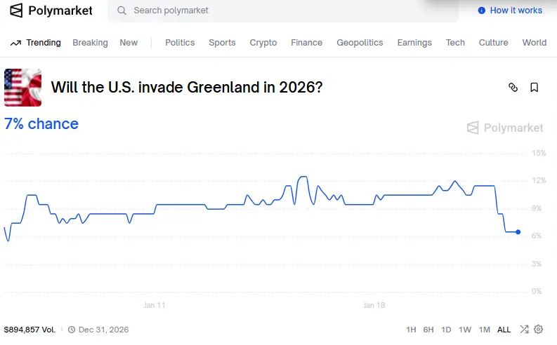 值得注意的是,市场的再定价并非完全始于官方表态之前。早在特朗普正式发声前,去中心化预测市场 Polymarket 上,与“美欧关税是否实施”“格陵兰相关升级风险”相关的合约概率已快速下行,显示投机资金正在提前押注局势缓和而非升级。