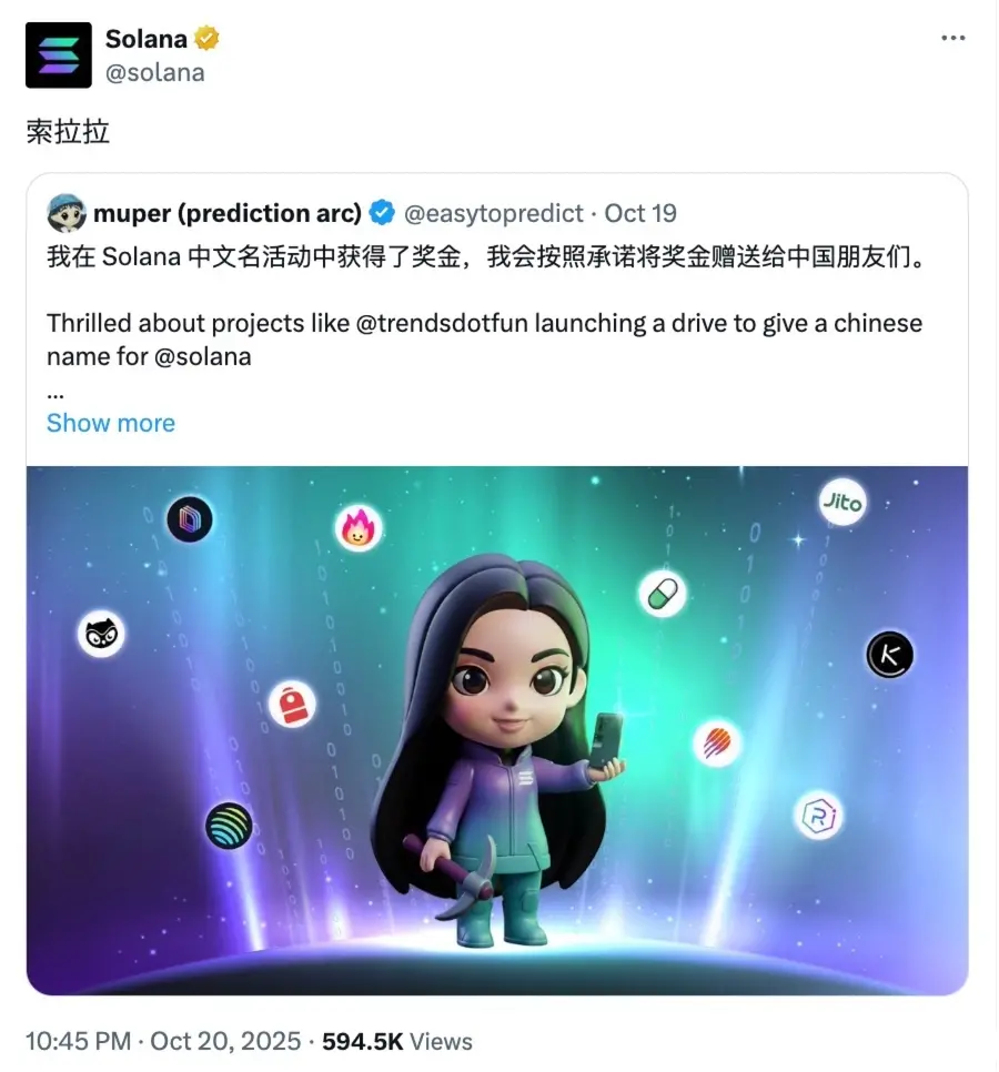 事情源于Solana的一次中文命名征集活动:10月中旬,内容平台Trends.fun发起“给Solana取中文名”活动,吸引了大批华语用户献计献策。短短几天内,“索拉拉”这个名字脱颖而出,不仅因为读音朗朗上口,更因为其创作者赋予了有趣的形象内涵——一个长发飘飘的女性建造者形象,象征每一位在Solana上奋斗的建设者。
