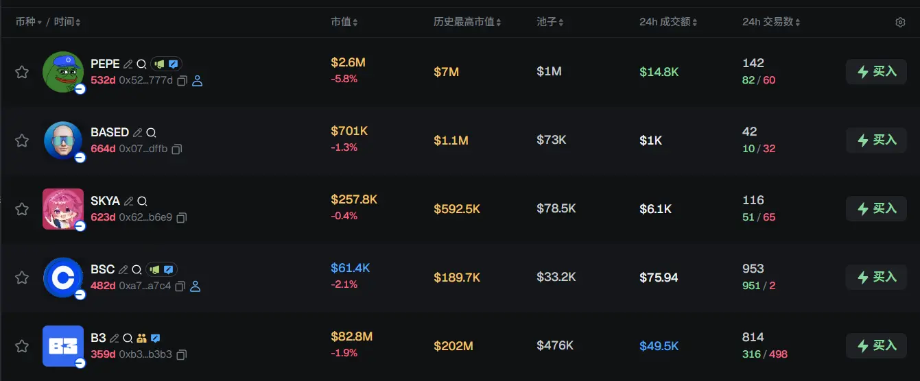 过去 24h Base 热门代币前五依次为:PEPE、BASED、SKYA、BSC、B3