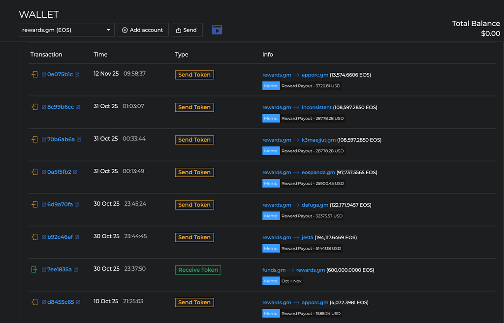 链上数据显示:资金由基金会 eosio.mware 账户打入 Greymass 同期新设立的账户 uxuiuxuiuxui;随后,该钱包按月向 http://funds.gm 账户转账,并备注「Operation USD/CAD 价格」,形似「工资发放」;再由 http://funds.gm 向 http://rewards.gm 转账,最终分发给若干账户如 jesta、inconsistent、http://apporc.gm 等,并注有「Reward Payout USD 数额」的转账记录;多数受薪账户在领取后快速转入 krakenkraken 账户或 Coinbase 等交易所套现。