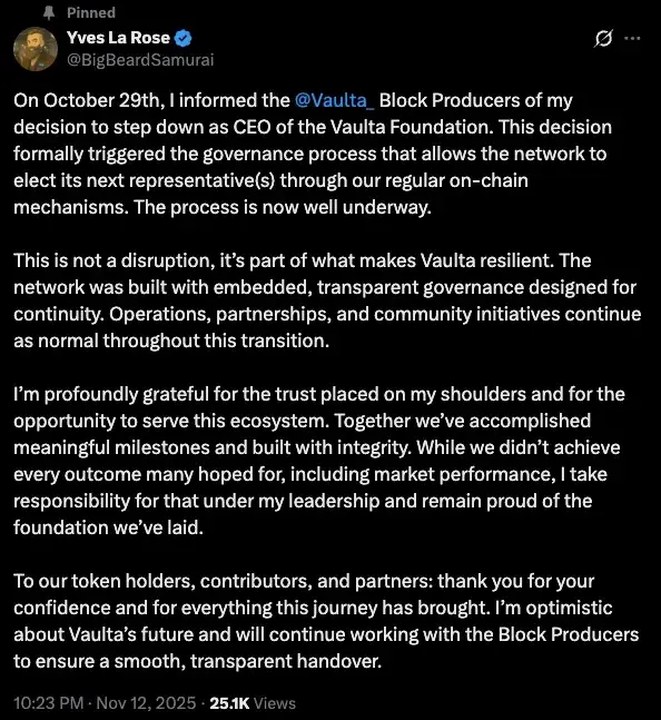 2025 年 11 月 12 日,Vaulta 基金会(原 EOS 网络基金会,下文简称 VF)前首席执行官 Yves La Rose 突然在 X 平台发表辞职声明,称已于 10 月 29 日通知网络 21 个出块节点(Block Producers)将主动卸任,并通过链上治理选举新代表。声明措辞体面,通篇充满「感恩」和「愿景」,但四周后社区惊讶发现——Vaulta 核心的多签账户依然掌握在 Yves 手中,根本没有交接。